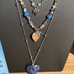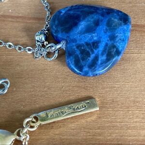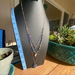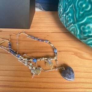 Summer Shores Necklace Featuring Blue Sodalite textured gold plated elements and textured silver plated elements axp 34 inches length.