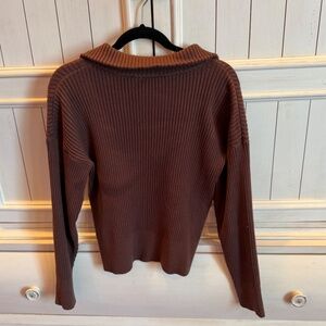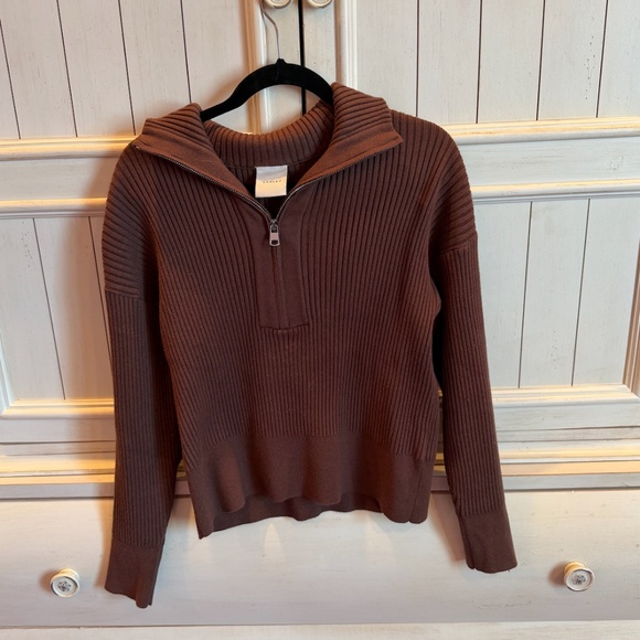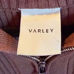 Women’s Varley ribbed half-zip sweater in a rich chocolate brown color. Features a cozy stand collar with zip neckline, soft ribbed knit throughout, and a flattering, slightly relaxed fit. Finished with long sleeves and a clean, minimalist look that’s perfect for casual wear, travel, or athleisure styling.