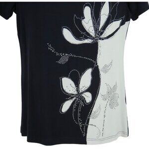 This black and white tee is like your new best friend—simple, stylish, and never says anything offensive. With rhinestone embellishments, it sparkles more than your personality. A floral design keeps you blooming all year round.