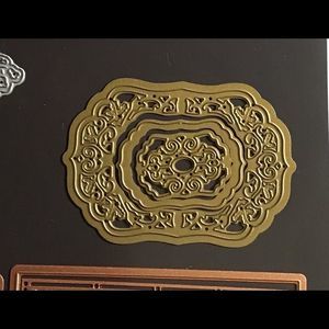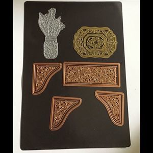 Bundle includes 3 corner die sets, panel die set, vase with flowers from Tattered Lace and 3 pc embellishment set from Couture Dies. Corner and panel dies are from Spellbinders. DS 158 BX 6