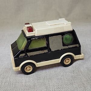 A nice variety of metal, plastic and rubber vehicles. There is a milk truck by Mattel, ambulance by Buddy L, a plane by sun rubber....missing part of the tail and propellers. Also there is a trailer that is missing part of the ladder.