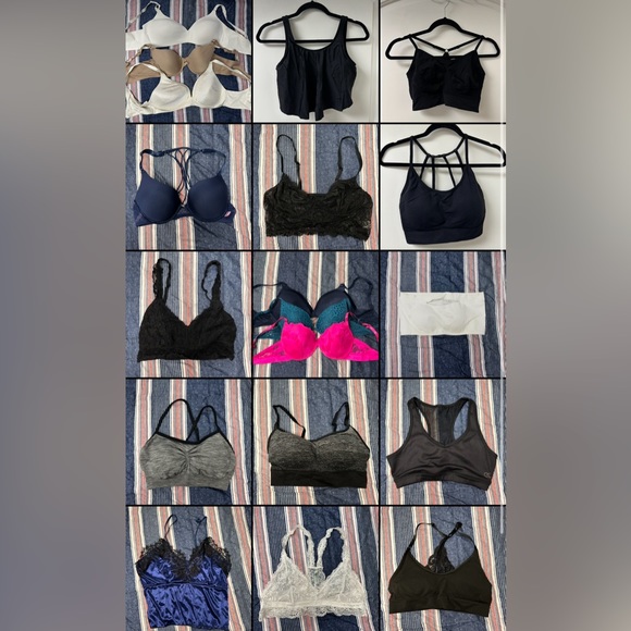 Small sports bras, lace tops, a bandeau bra, and your average everyday bras (34B-36C)