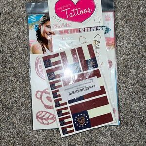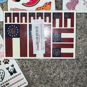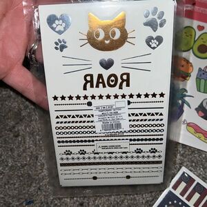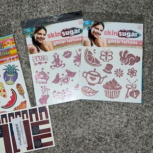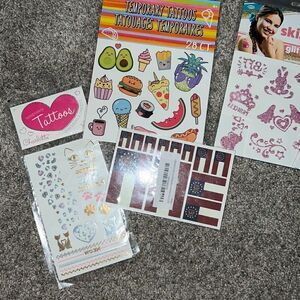 This is a listing for five packs of temporary tattoos for kids in different styles. 4 of these are new and the 5th is missing only one temporary tattoo. Some of these sparkle, some are food themed tattoos. Ice Cream, Sushi, Pizza, Cupcakes, The State flag of Georgia, Cats, Princesses, butterflies and so many more!