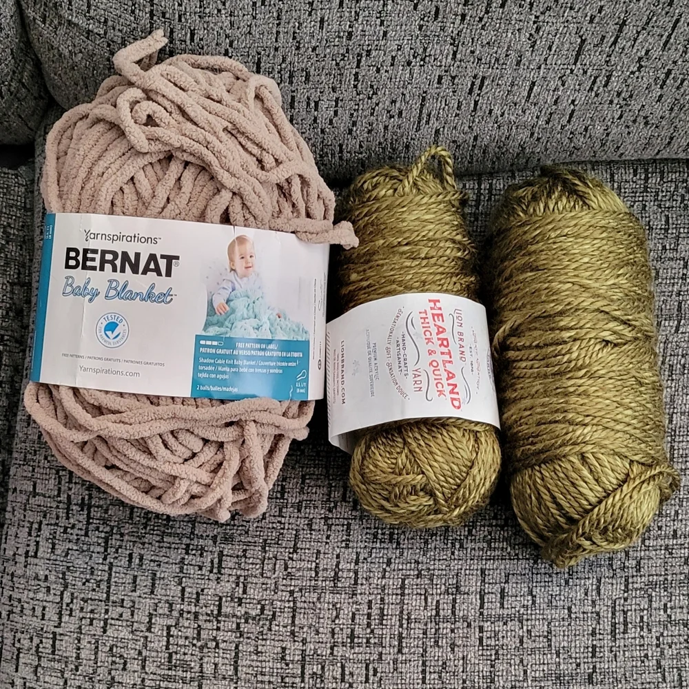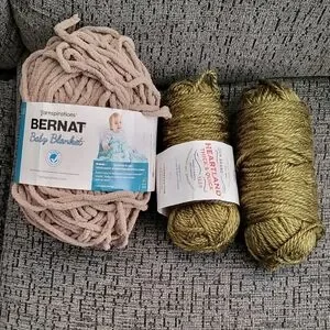 Skein of Bernat Baby Blanket ~Baby Sand color (a bit used) 2 skeins Heartland Thick n Quick yarn ~Joshua Tree color (some used)