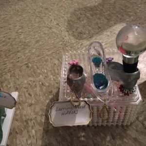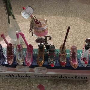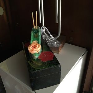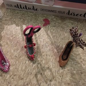 Various mini decor shoes. $12- $15 per shoe. The mini shoes are multi- purpose - use them as mini diffusers. Just put you scented oil on the flower or sticks and let the shoe do the rest. used as paper weights on your desk, pen/ pencil tool holders, cricut tool supply holders, or for a little girls collection or in her dollhouse.