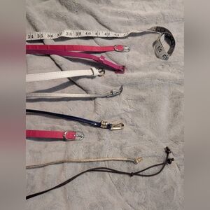 I have a few belts I can't wear anymore. Thin and about 40 to 45 inches long. I have 2 fuchsia that are the same but one is a little longer than the other. I have white, silver and navy blue.