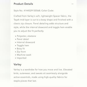 Varley Tahay Zip up, nwt! can see where security tag was as shown in pictures, should go away with wash/wear