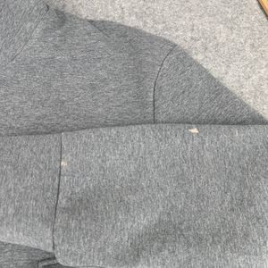 No rips, or tears. Missing elastic waist ties+ Bleach staining on sleeve, see pictures.