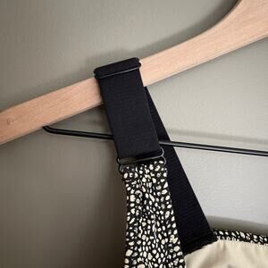 Varley Edris Sports Bra in Mixed Pebble, Size XS, Black with Tan Cream Polka Dot Spots Print, Open Back, Adjustable Straps, In like new condition with no flaws or signs of wear.