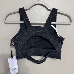 Varley sports bra with adjustable, wide, comfortable straps and removable light padding. Black with olive green pattern. Measures 12 inches across. NWT