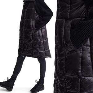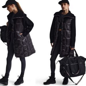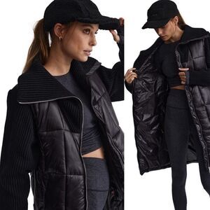 Varley Mayten Knit Puffer Jacket Black Mock Neck Zipper Ribbed Long Coat