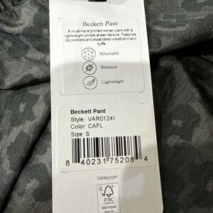 This is a Varley Beckett Pant in Camo Floral, featuring a drawstring closure and made of lightweight nylon. The jogger style pants have a tapered leg and a 28-inch inseam. They are machine washable and designed for outdoor activities and athleisure, ideal for gym, walking, running, and yoga in all seasons. New with tag.
