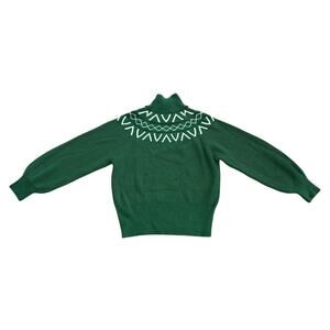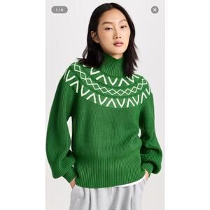 The Varley Sweater is a stylish and versatile pullover designed for women in size small. The sweater features a green Fairisle geometric pattern, long balloon sleeves, and a turtleneck neckline, making it perfect for casual occasions in the winter, fall, and spring seasons. Made of a blend of polyester, nylon, and viscose, this chunky-knit sweater from the brand Varley offers stretch and is machine washable for easy care. Its classic yet modern design with ski-inspired themes makes it a must-have for any fashion-forward individual looking for a cozy and trendy addition to their wardrobe.