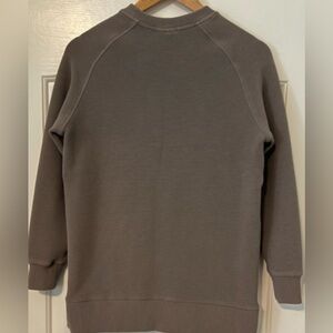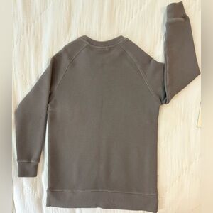 Stylish and versatile Varley Vine Side Zip Sweatshirt in women’s size XS. Color is a taupe/brown ribbed knit with side zippers for adjustable fit and layering. Crew neckline with raglan sleeves, relaxed silhouette, and premium athleisure design. Perfect for casual wear, lounging, or layering after workouts.