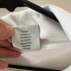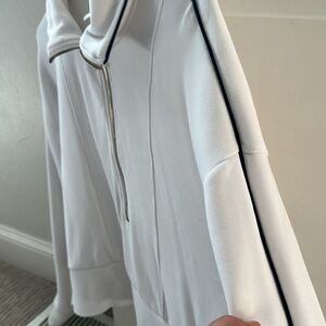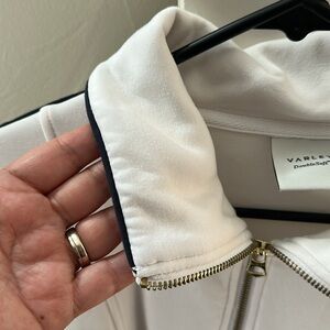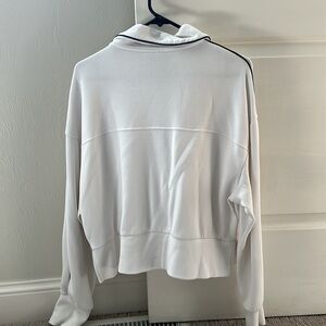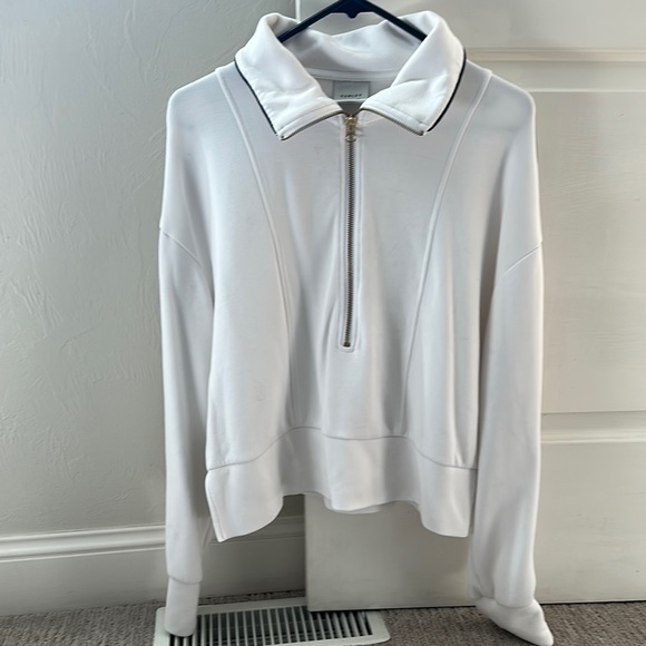 White with navy piping down arm and around collar size large. Half zip