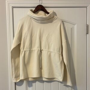 Elegant cream cowl neck sweater by Varley. Features a relaxed fit and adjustable waist tie. Ideal for layering.