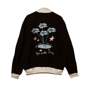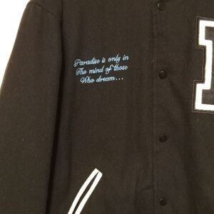 Letterman Bomber Varsity Style Barn Coat Jacket Long Sleeve Elasticized Wrist & Waist Fully Lined. This is a Fashion Nova Men "Love Is A Drug" Statement piece. The jacket is black and white featuring a large embroidered "P" on the front, representing the word “Paradise“, and a floral design on the back that says "Love is the drug", as well, there is a phrase embroidered on the right chest that says, “Paradise is only in the mind of those who dream.”