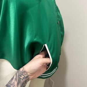 Green and white varsity jacket with embroidered logo #varsityjacket #y2k LA lettermen’s jacket