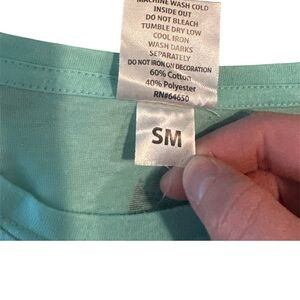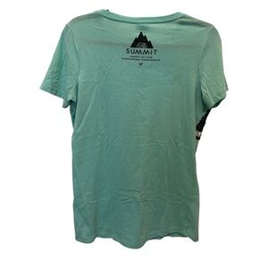 Mint green/blue short sleeve tee with bold SUMMIT sequin panel across the chest. Crew neck and casual fit. Shimmering black and silver sequin detailing. Easy, sporty styling. Size is Small/Medium.