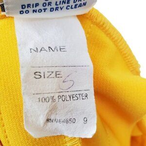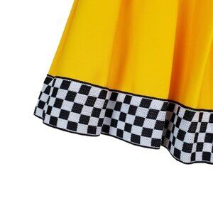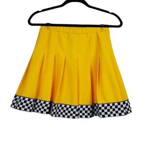 Varsity pleated checkered border skirt in yellow, white, and black. Checkered border hem. Pull-on skirt. Pleated mini skirt. No stains or holes. Made in the USA. Casual cheerleader costume cosplay sporty skirt.