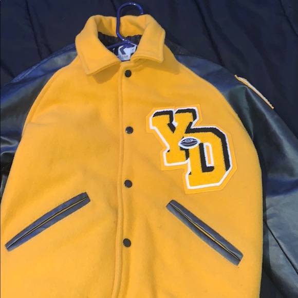 Nice varsity jockey type jacket females and males can wear Nice color way yellow black and white with nice detailing
