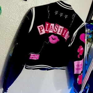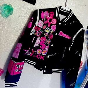 Dark blue white and pink crop varsi jacket