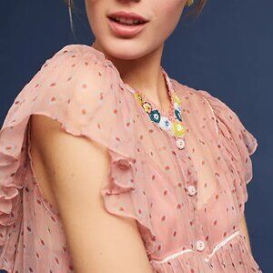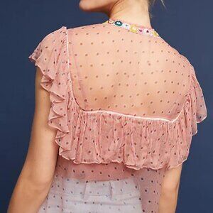 Varun Bahl Beaded Ruffled Nude Pink Polka Dot Sheer Cupro Button Up Blouse XS