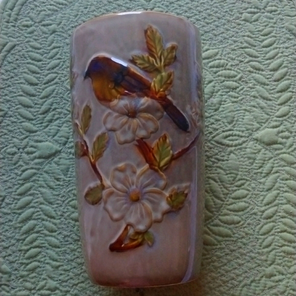 Grayish with a bird scenery with foliage has rocks in the vase to keep plant or flowers steady