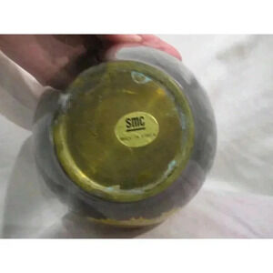 Black Lacquered Brass Vase with peacock and floral decoration. Gently vintage condition with a tiny chip in the base and some tarnishing on the interior. Marked with SMC made in Korea. 6.5" H x 6" D.