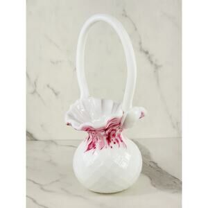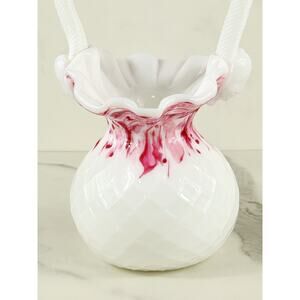 Vase Ruffled Rime w/ Face on Handle 11" Art Milk Glass Basket 80's White Pink