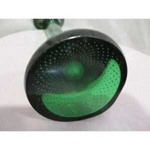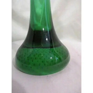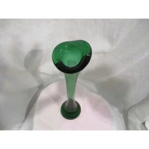 Vintage Aseda Glasbruk Green glass Bone vase - controlled bubble vase. The bare-bones. This is the first large, single-colored Aseda vase we have come across. Designed in 1952 by Per Lutken for Holmegaard, it was made by Aseda, who added the controlled bubbles. Its shape has resulted in it being commonly known as the "Bone vase." The single-color versions are more attractive, as you see the actual shape. A colorful piece to add a bit of mid-century modern decor to your home. A heavy bubble glass base with controlled bubbles. Mid-Century Modern 'Jack in the Pulpit' or 'Bone' Shaped Controlled Bubble Art Glass Vase. This beautifully shaped art glass vase is emerald green. We believe this vase was made by the Swedish glass company Aseda Glasbruk who produced many art glass vases between 1947-1974. Measures 10"H x 3" D.