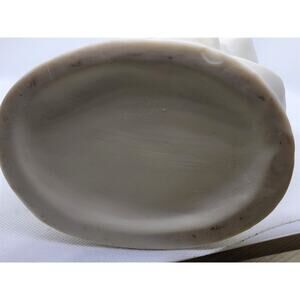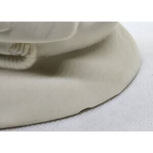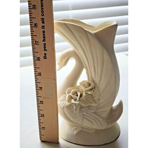 Beautiful ivory porcelain bisque swan vase. Swan with two formed roses and leaves embossed at the swan's neck. The swan is formed at the bottom of the vase. Beautiful simple piece. There is a small chip on the bottom. It doesn't really show, but there is a little bit showing when sitting flat. It is on the right back side when looking from the front. See last 4 pictures where the chip is clearly shown. The small chip doesn't take away from the vase. It is a art deco style that is simple and elegant.