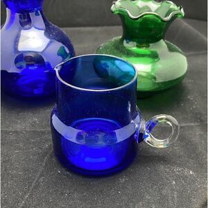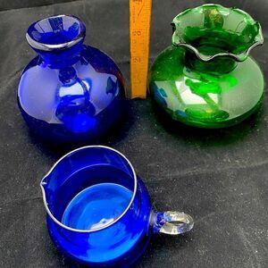The vases you were looking at are from my private collection the ruffle top anchor hocking Emerald is at least from the 1930s and 1940s and belonged to my great aunt. The two cobalt items came from West Virginia when my daughter was in college 25 years ago I used to collect these little vases and display them in the windows it’s time to liquidate