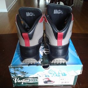 Here is another very nice pair of Vasque Knockout Hiking Boots. Size 6G: Finished in black/carmine/ grey leather mixed upper nylon mesh with Gore - Tex construction. Padded insole for comfort. Pyrenees outsole for extra grip. Very Light. Worn a few times.