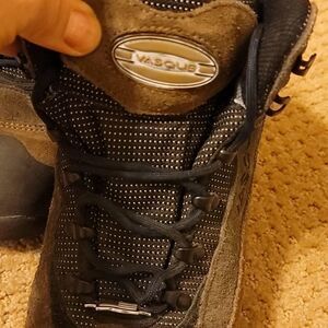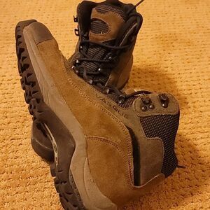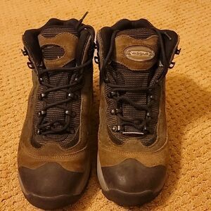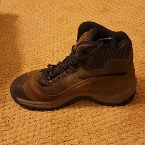 Great pair of hiking boots. Very nice used condition. Super sturdy and durable. There is a logo missing on one shoe.