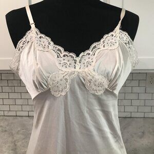 Features: Adjustable spaghetti straps; scalloped lace at neckline and hem; gathered/ruched bust detail; soft, silky fabric with light sheen; mid-length coverage