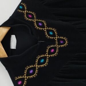 black velour with gold stitching and turquoise pink and purple embroidered detail
