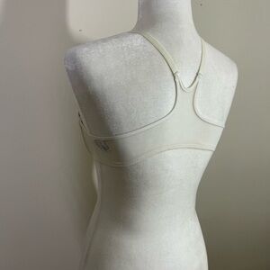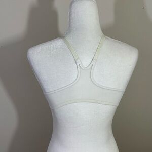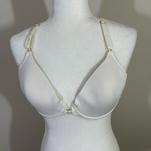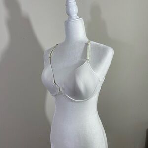 Very nice bra in a soft white. The t-shirt bra has sheer panels which go from side to side as the closure is in the front. Lightweight padding. No visible flaws. Any questions please ask. Will answer questions as soon as possible. L