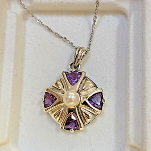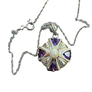 The Vatican Library Collection 18” 925 Sterling Silver Chain & Pendant Necklace - a 1" diameter pendant with with faceted Purple Stones and a pearl bead at the center. This is a beautifully crafted piece of jewelry that pays homage to Christianity. The necklace features a stunning pendant design - highly collectible - a timeless piece that can be worn proudly to showcase one's faith and appreciation for religious artifacts. Pendant is clearly hallmarked 925 / includes original box & certificate - excellent condition and just stunning!