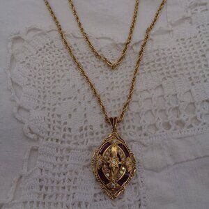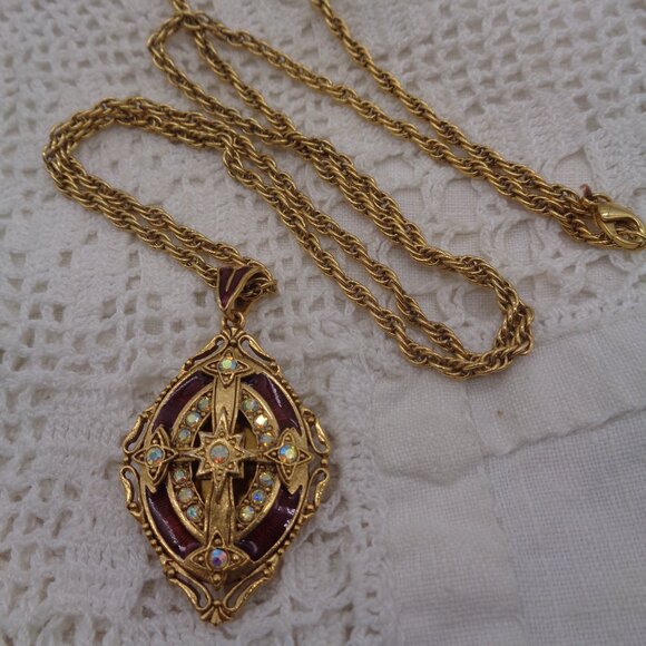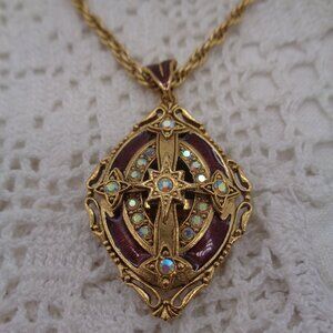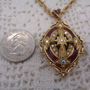 This gorgeous pendant necklace is signed Vatican Library inside the locket. The pendent locket measures 2", including the bail, and the gold tone chain measures 30". The locket is gold tone, with rust red enamel. There is a cross in the center and aurora borealis rhinestone accents. This piece is in very good condition and is high quality. Check out my closet....bundle and save on shipping!