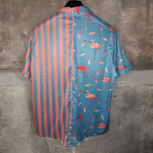 Vatpave Pink & Blue Hawaiian Flamingos & Stripes Button Casual Shirt LARGE