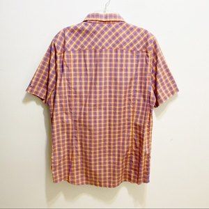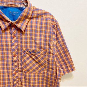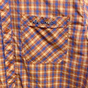 Vaude orange and blue plaid short sleeve button up shirt in excellent condition. Single breast pocket, embroidered logos and extra button.