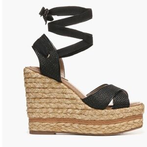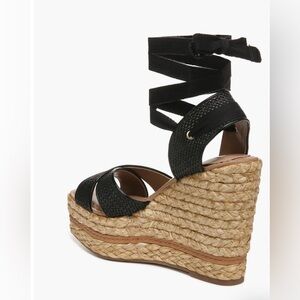Textured straps and wraparound ankle ties create modern dimension on an espadrille-inspired sandal lofted by a raffia-covered platform and soaring wedge heel.