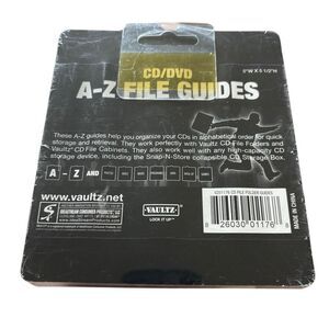 Vaultz CD/DVD A-Z File Guides. A-Z, Photos, Video, Music, Programs, Data, Back-Up, Games File Guides. 5” wide, 5.5” high. New in package.