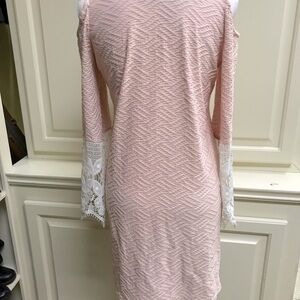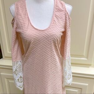 VaVa by Joy Han Sexy Cutout Embroidered Lace Sleeve Dress Cute Vava by Joy Han dress. Apricot color. Such a pretty shade of pastel peachy pink. 3/4 bell crochet lace detail sleeve details. Above the knee. Slightly fitted. Pullover. Size small or 4-6. Can be dressed up or down with Pearls or trendy pieces. Only Worn once. Lightweight quilted polyester/spandex fabric with ecru lace. Fully lined. Approximate Measurements in pics. Excellent like new condition.