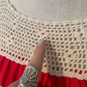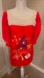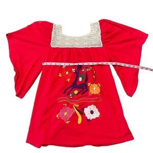 Adorable embroidered Top by Joy Hon. Crochet neckline. Flowing sleeves. Awesome embroidered design and vibrant red color. 95% cotton, 5% spandex.