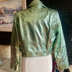 Veda Metallic Mint Green Cropped Leather Biker Jacket | New Without Tags
