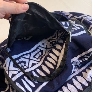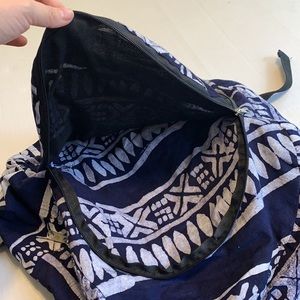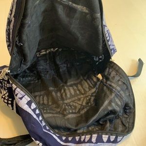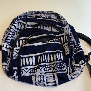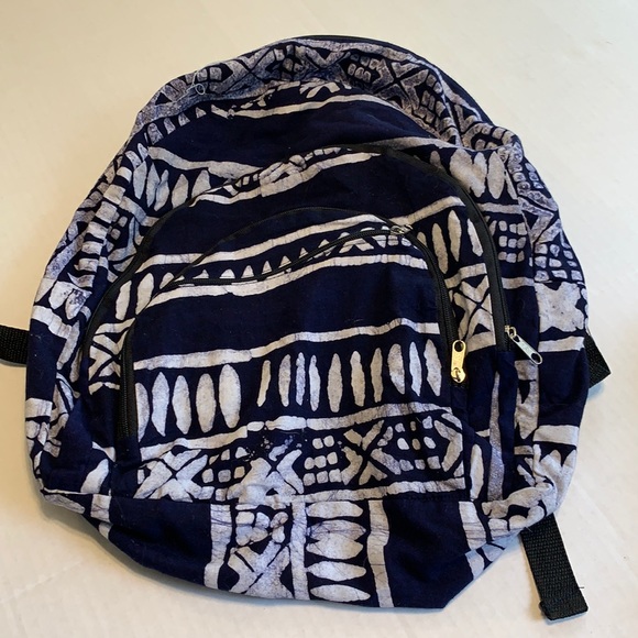 Fabric vegan backpack. Many compartments 3 front zipper pockets. Very light eight. Size medium/large.