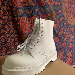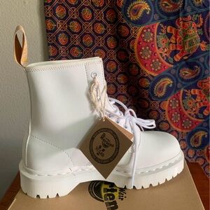 Never compromise. Docs elevated Bex sole brings added height and attitude to these classic vegan boots. Otherwise, they're the exact same 1460 boots they've been making for six decades: with 8 eyelets, mono white welt stitching and a scripted AirWair heel loop.