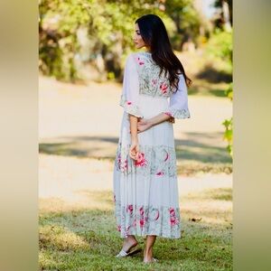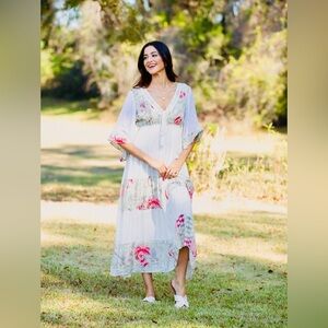 Vegan Fair Trade flowy white tiered, floral bohemian maxi dress